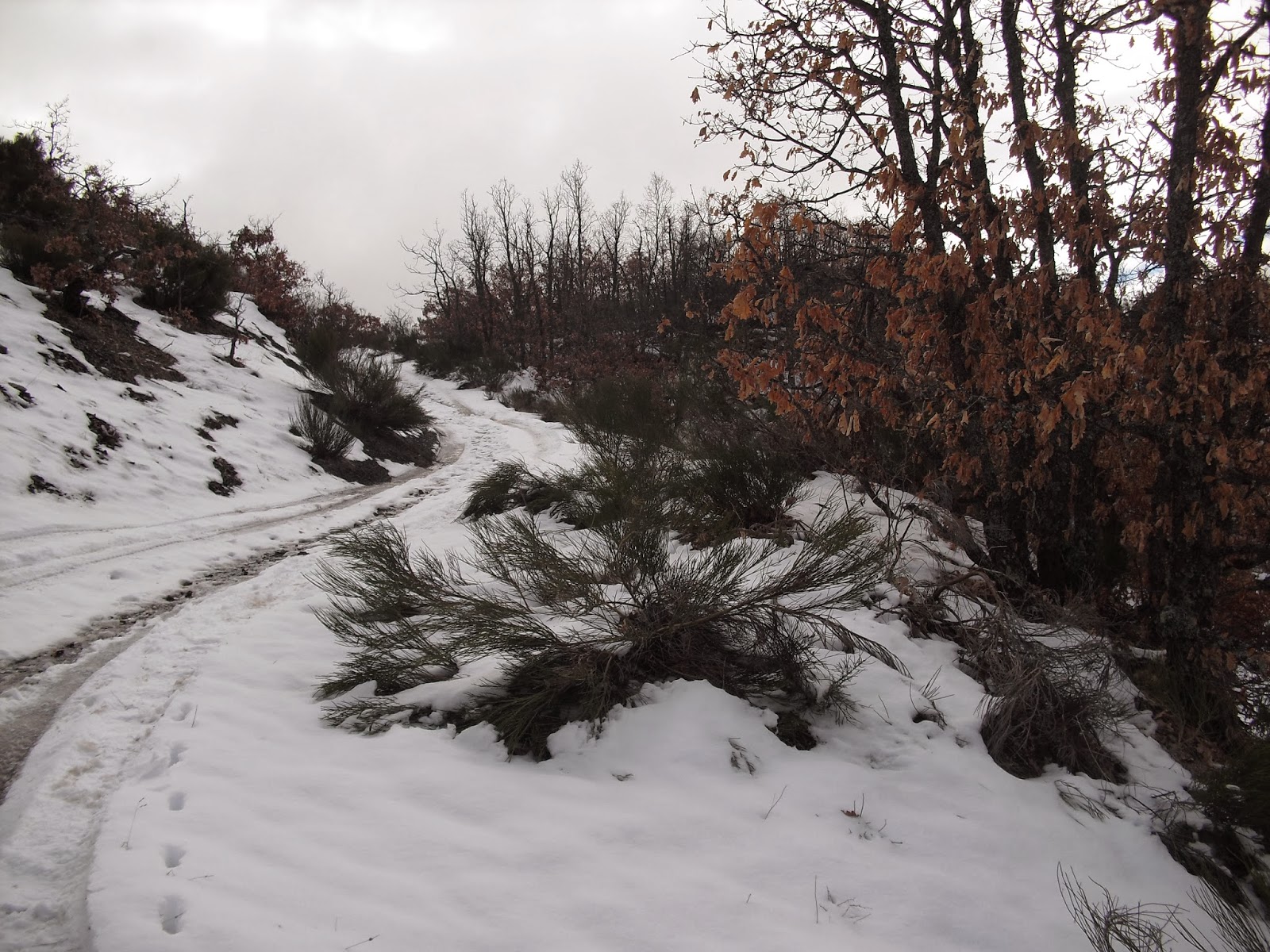Después de un núcleo rocoso accedemos a la falda de la montaña, pero la niebla y la nieve helada que nos rodea nos determina a no continuar la subida y bajar por una vallina hasta adentrarse en el robledal.
